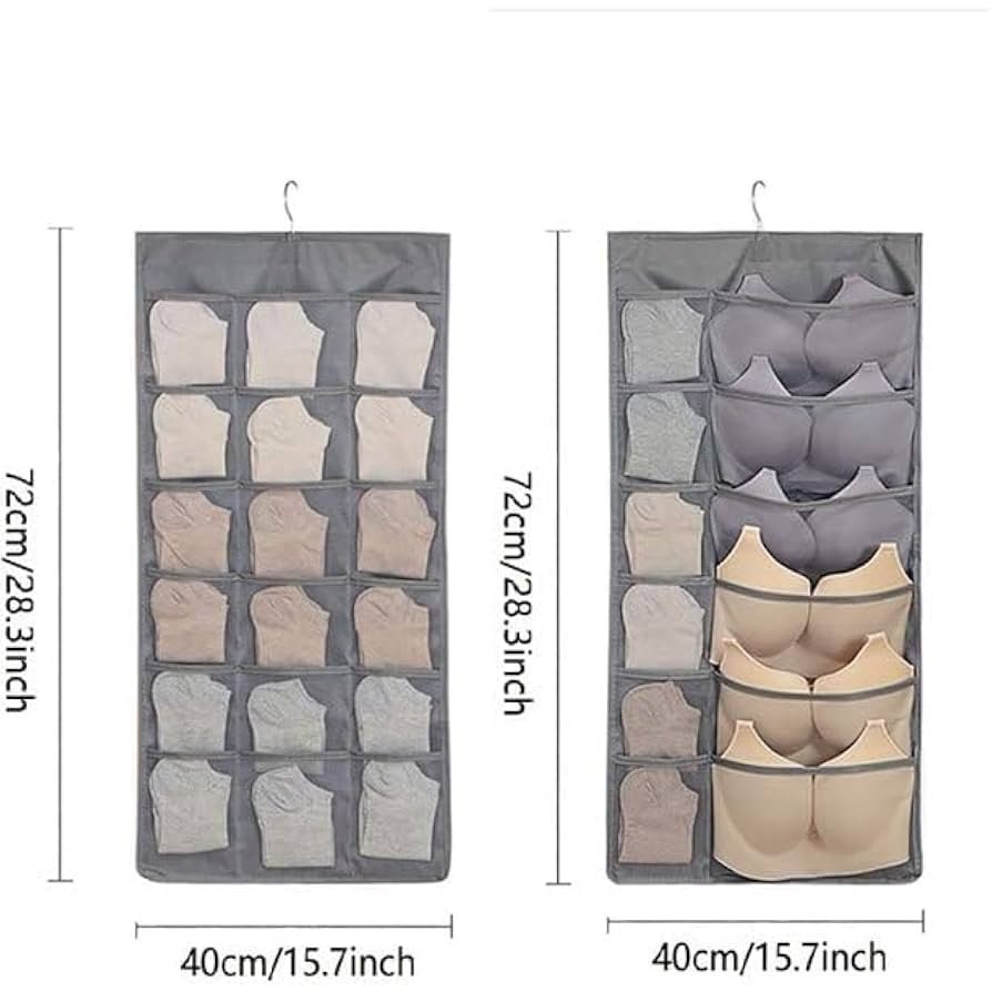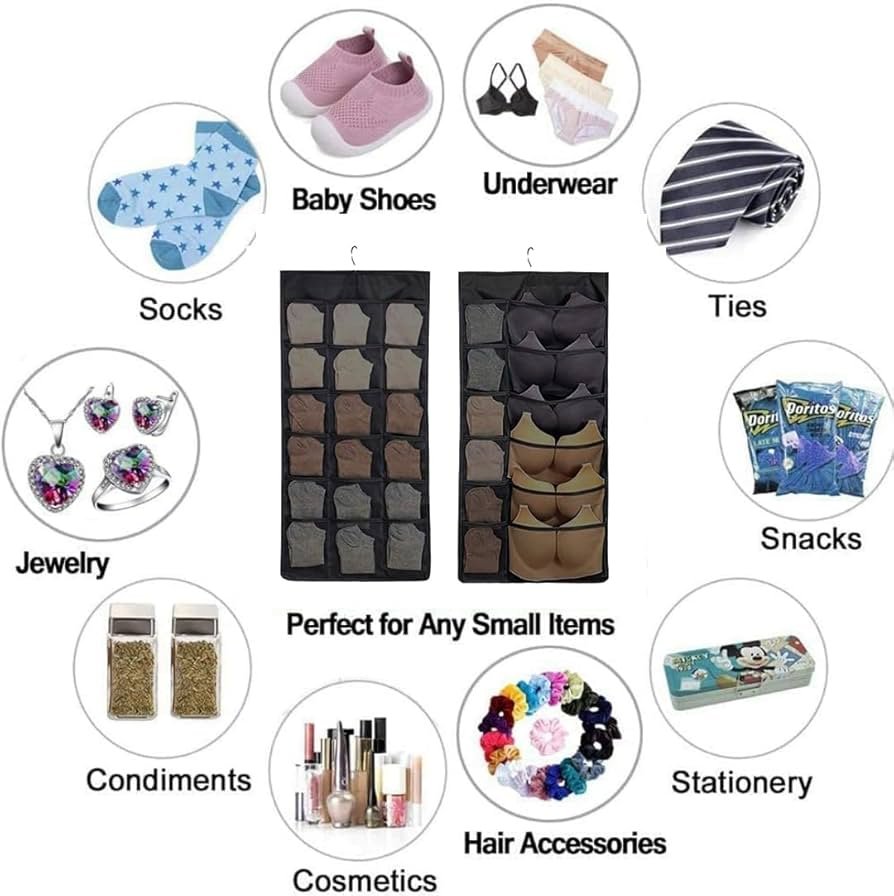 Double-sided 30-pocket hanging organizer in black, perfect for underwear, bras, socks, and small clothing items. Space-saving, multifunctional, and wall-mountable for easy wardrobe organization.