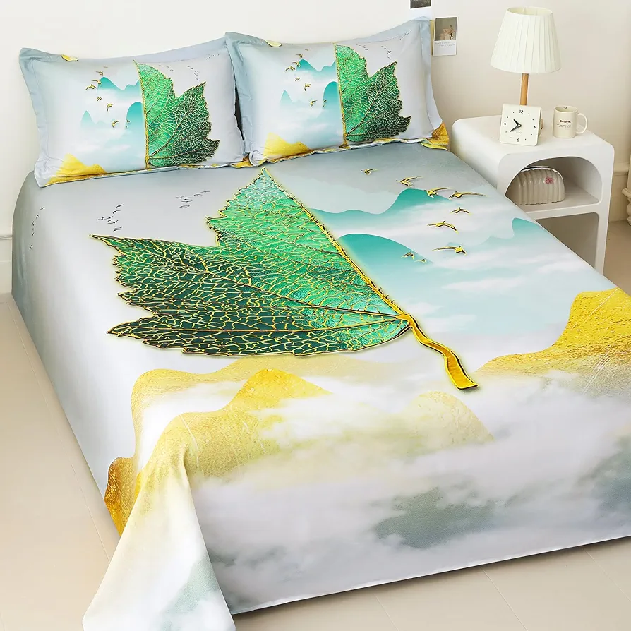 300 TC Satin Finish Bedsheet for King Size Bed – Dark Blue & Beige Ethnic Motif Design | 1 Double Bedsheet with 2 Pillow Covers (250 x 270 cm)