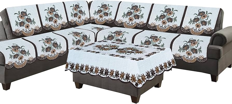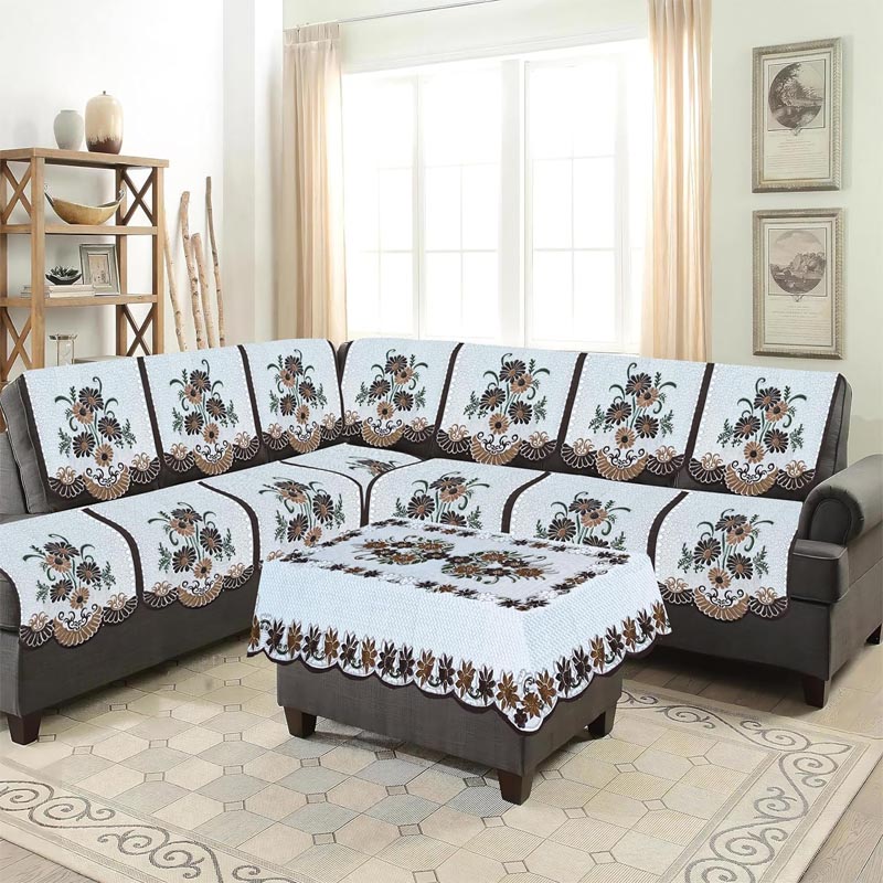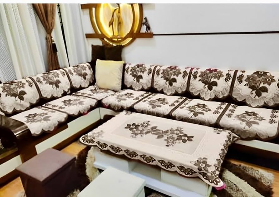 Cotton Floral Printed Designer L Shape Sofa Cover 7 Seater Set (Slipcovers) with Table Cover for Your Home Long Sofa (Set of 15)(Color-Brown)23