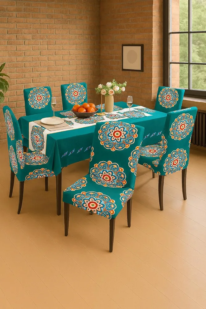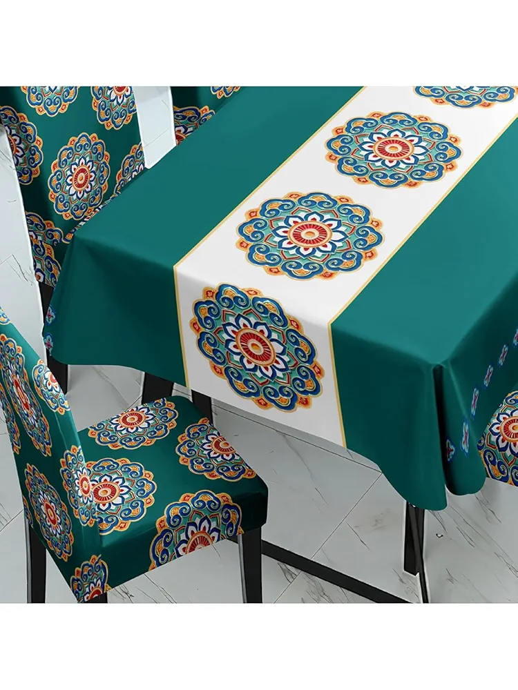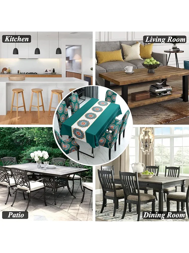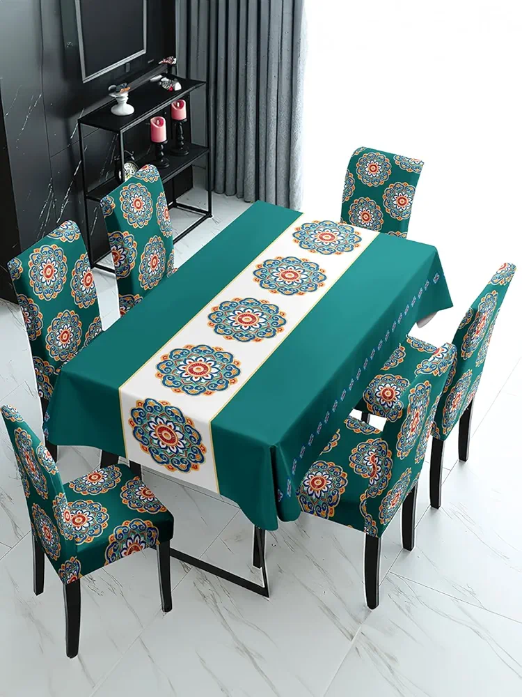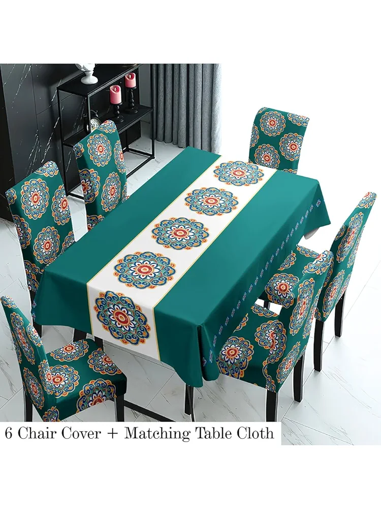 Waterproof dining table and chair cover set – includes 1 PVC tablecloth and 6 stretchy chair covers for full dining set protection.