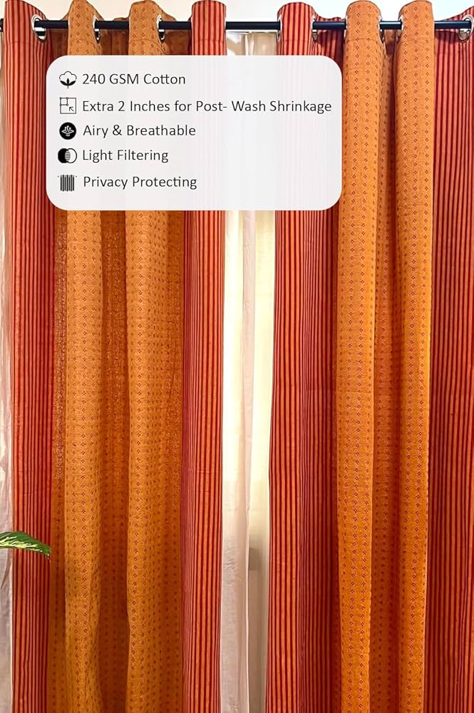 Handloom 100% Cotton Curtains For Door, 70-75% Room Darkening Cotton Curtains Long Set Of 2 With Eyelets (Rusty Orange, Door-7 Feet X 4 Feet, Printed, Sheer)
