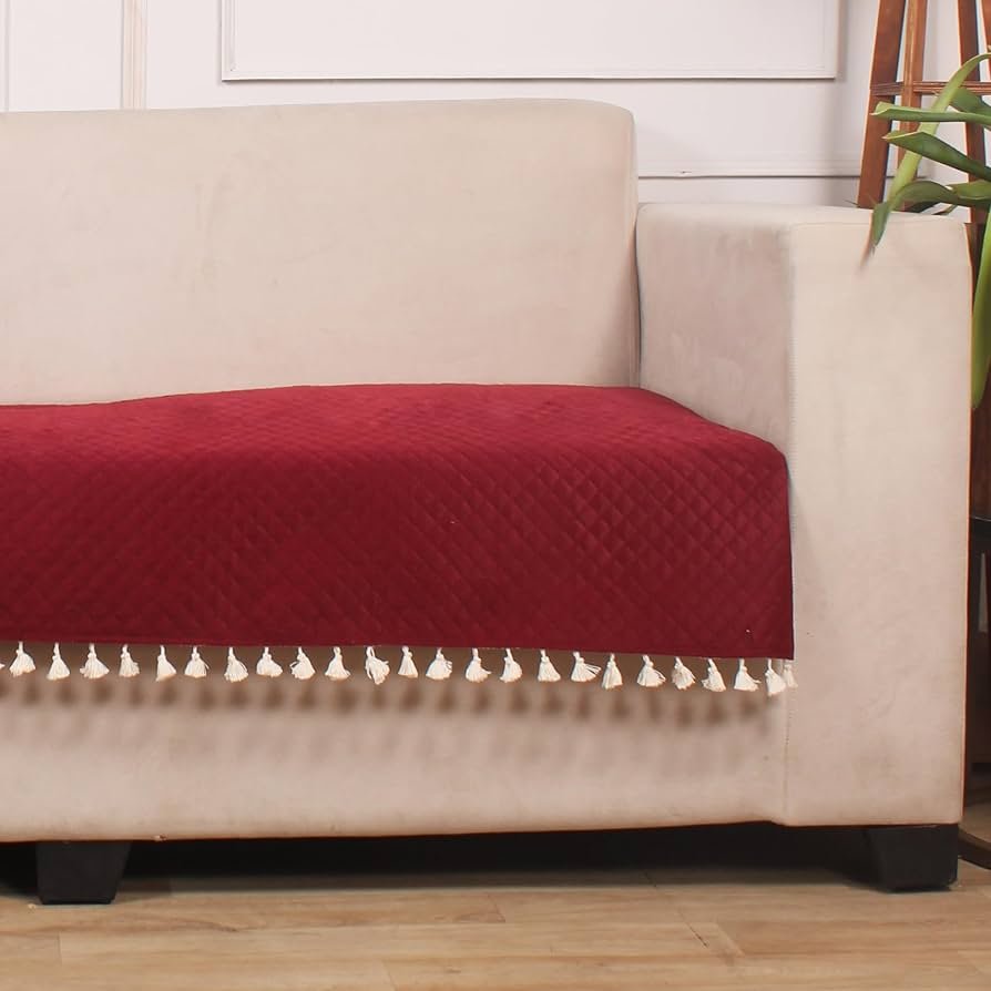 Maroon Quilted Velvet Sofa Cover – Washable, Tassels, Luxurious & Comfortable