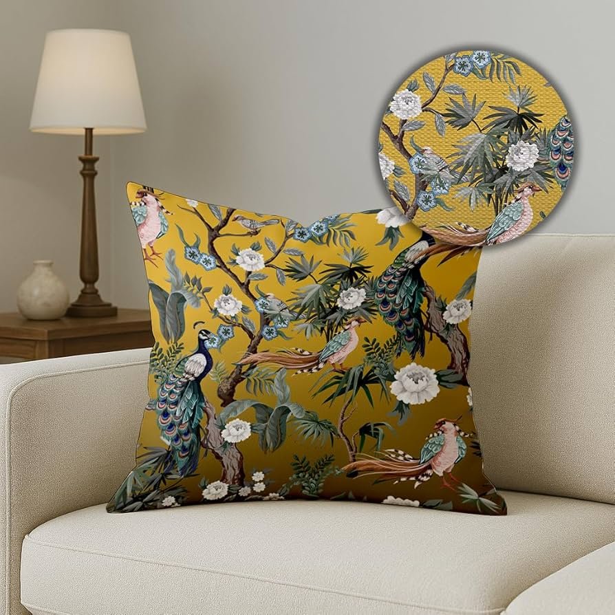 Mustard Yellow Peacock Printed Polycotton Cushion Covers _ Decorative Square Throw Pillow Cases for Sofa, Living Room & Bedroom _ Set of 5 (16 x 16 Inches)
