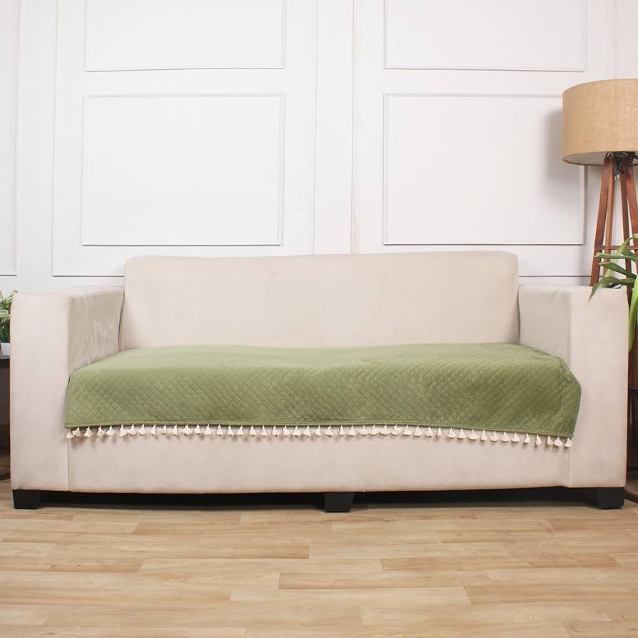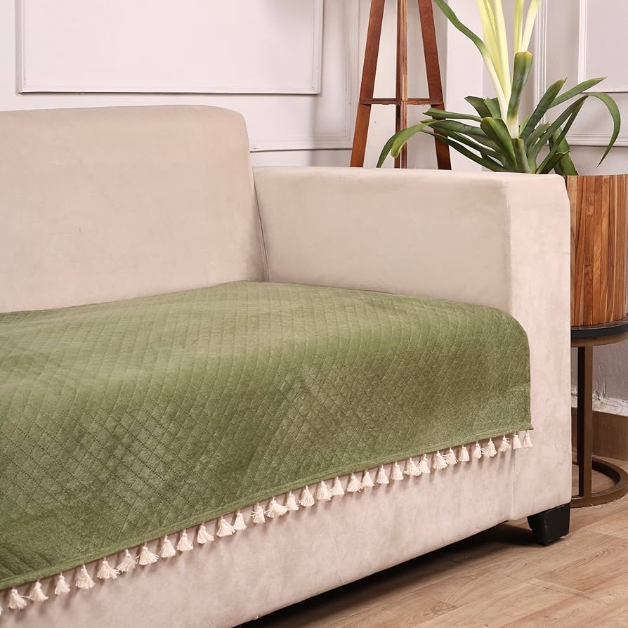 Olive Quilted Velvet Sofa Cover – Washable, tassels, luxurious & soft, protects from spills, stains, and pets. Rs. 500 inclusive of taxes.