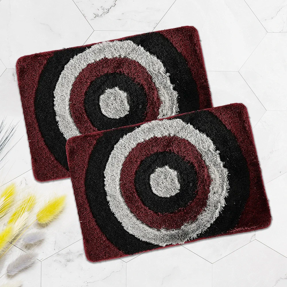 Pack of 2 Anti-Slip Bathroom Mats – Furry Polyester Door Mats for Home Entrance, Kitchen & Bathroom (Grey & Maroon, 61×41 cm)