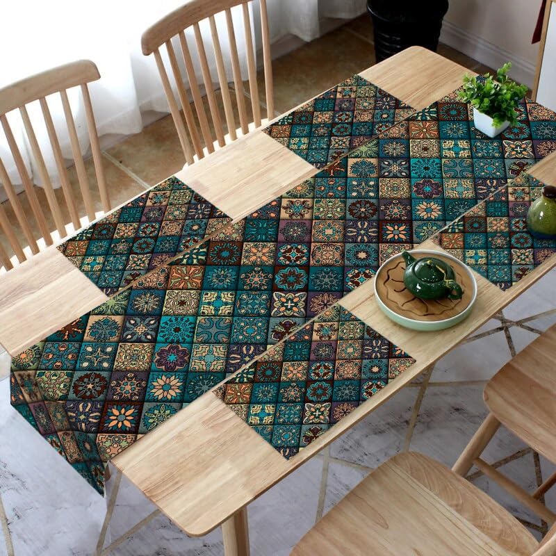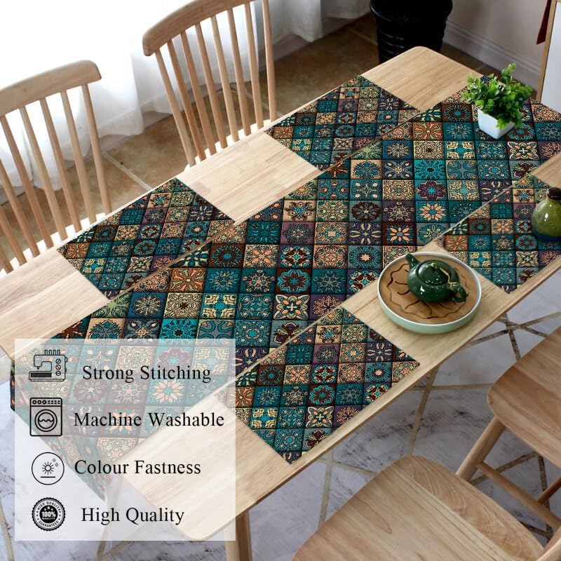 Polycotton HD Creation Set of 4 Placemats and 1 Table Runner 13×60 Inch , Moroccan Tiles Green Design Digital Printed