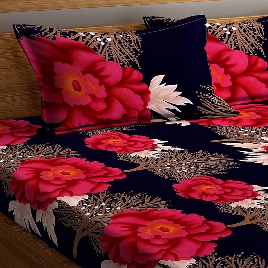 Polycotton Printed King Size Double Bedsheet with 2 Pillow Covers, (90 x 90 Inches,) Blue Red