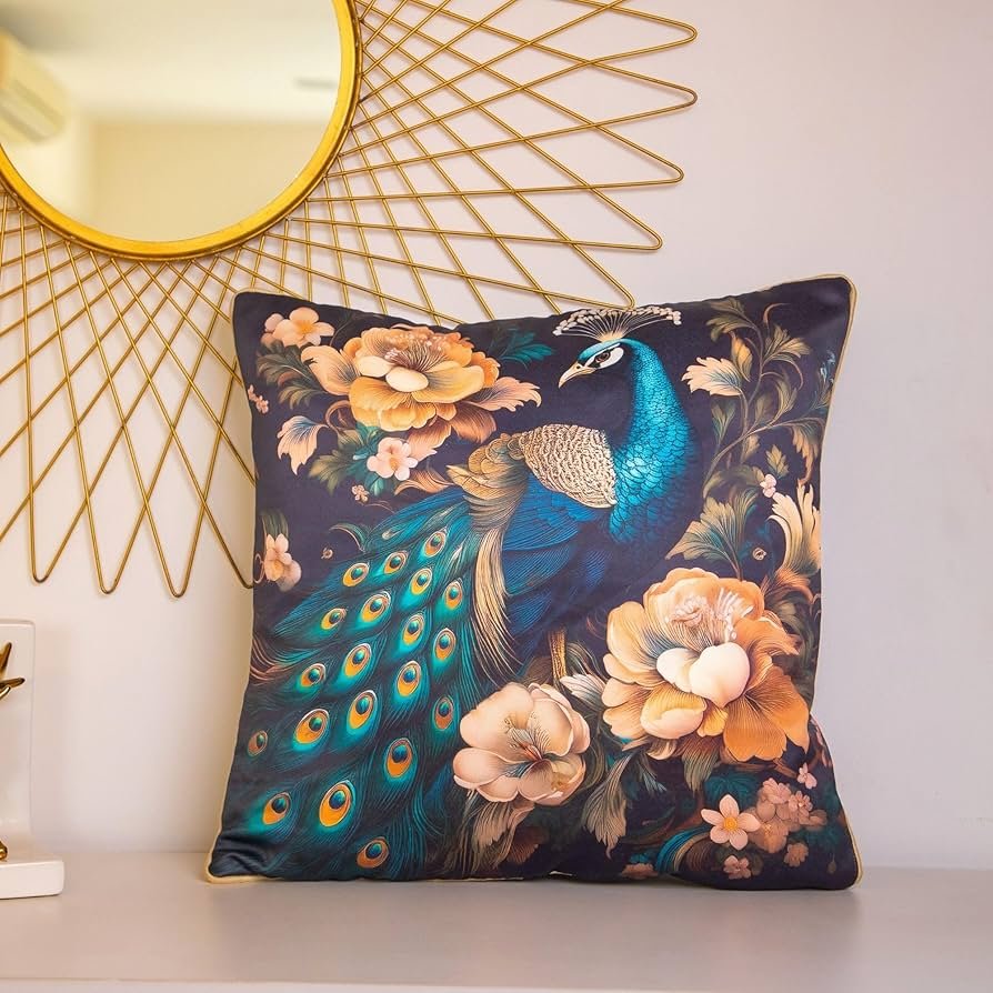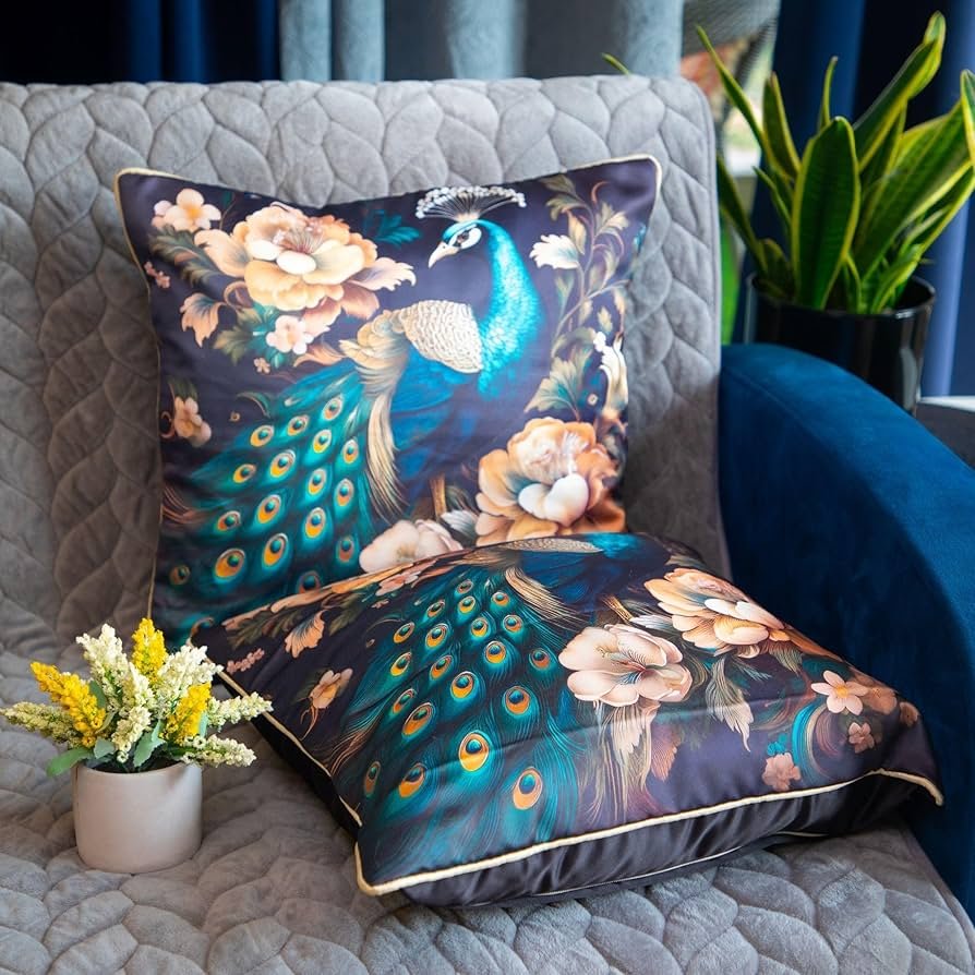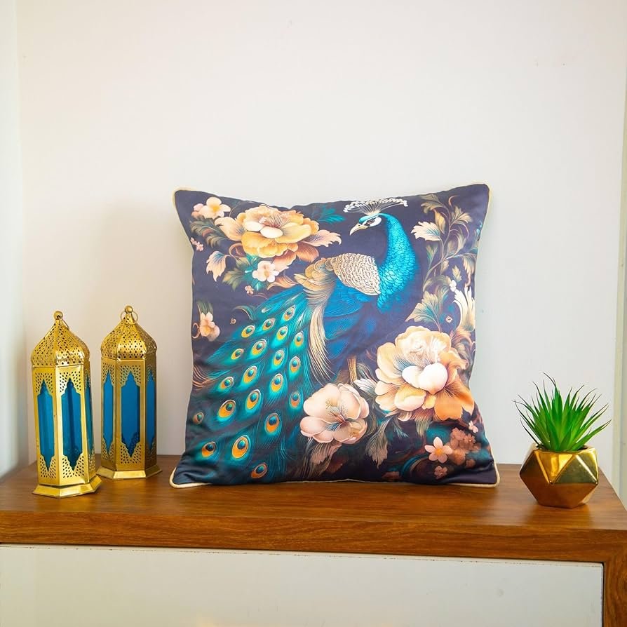 Stylish Heritage Boho Peacock Satin Cushion Cover (16×16 inches) – modern luxury design, durable satin & perfect for sofas, chairs, and beds.