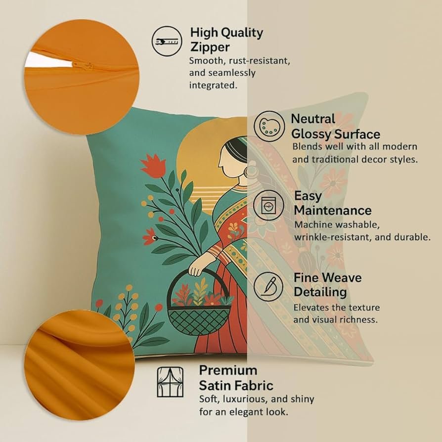 Satin Cushion Covers Elegant Woman in Saree with Basket & Flowers, 16×16 Inch, Pack of 5 for Ethnic Sofa Styling & Gifting