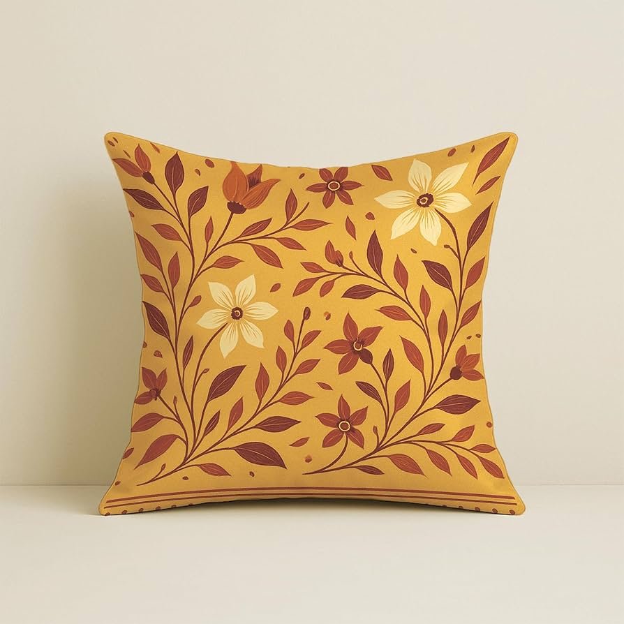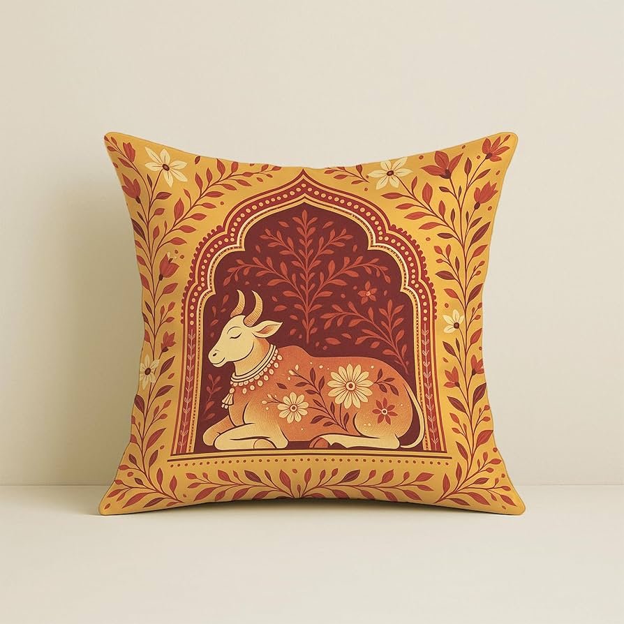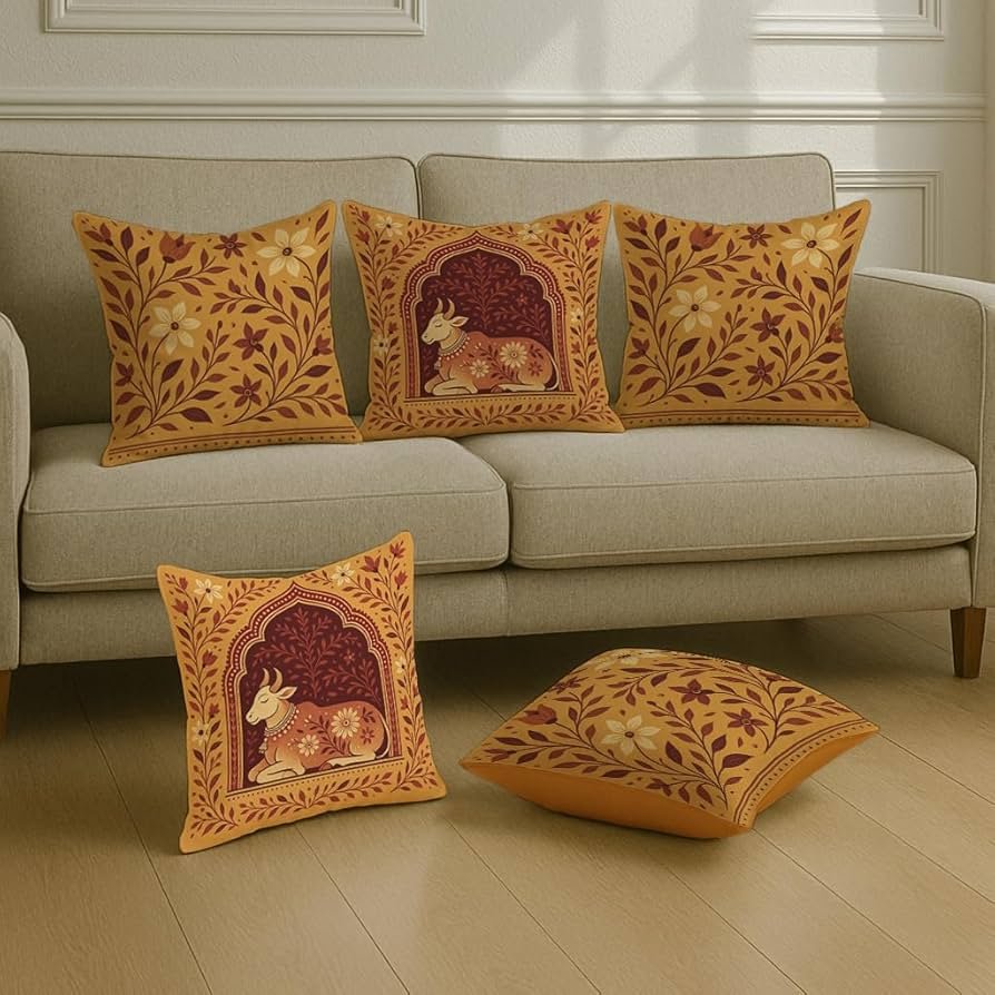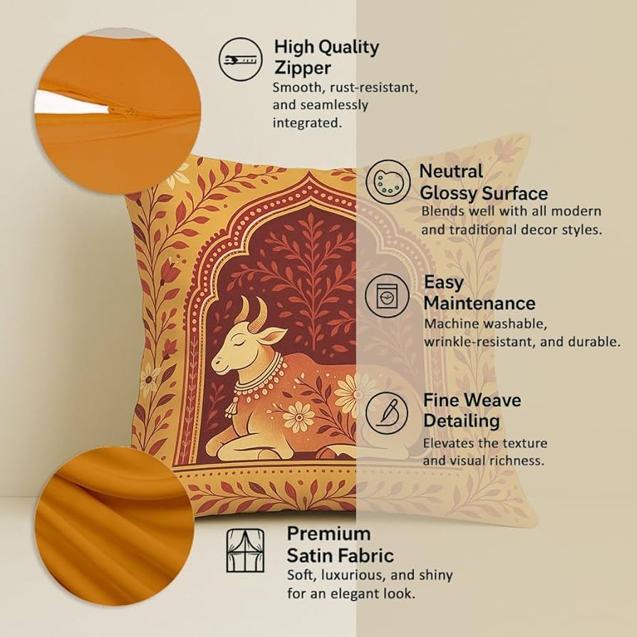 Satin Cushion Covers Traditional Cow and Floral Design in Rajasthani Style, 16×16 Inch, Pack of 5 for Spiritual & Artistic Living Room Decor